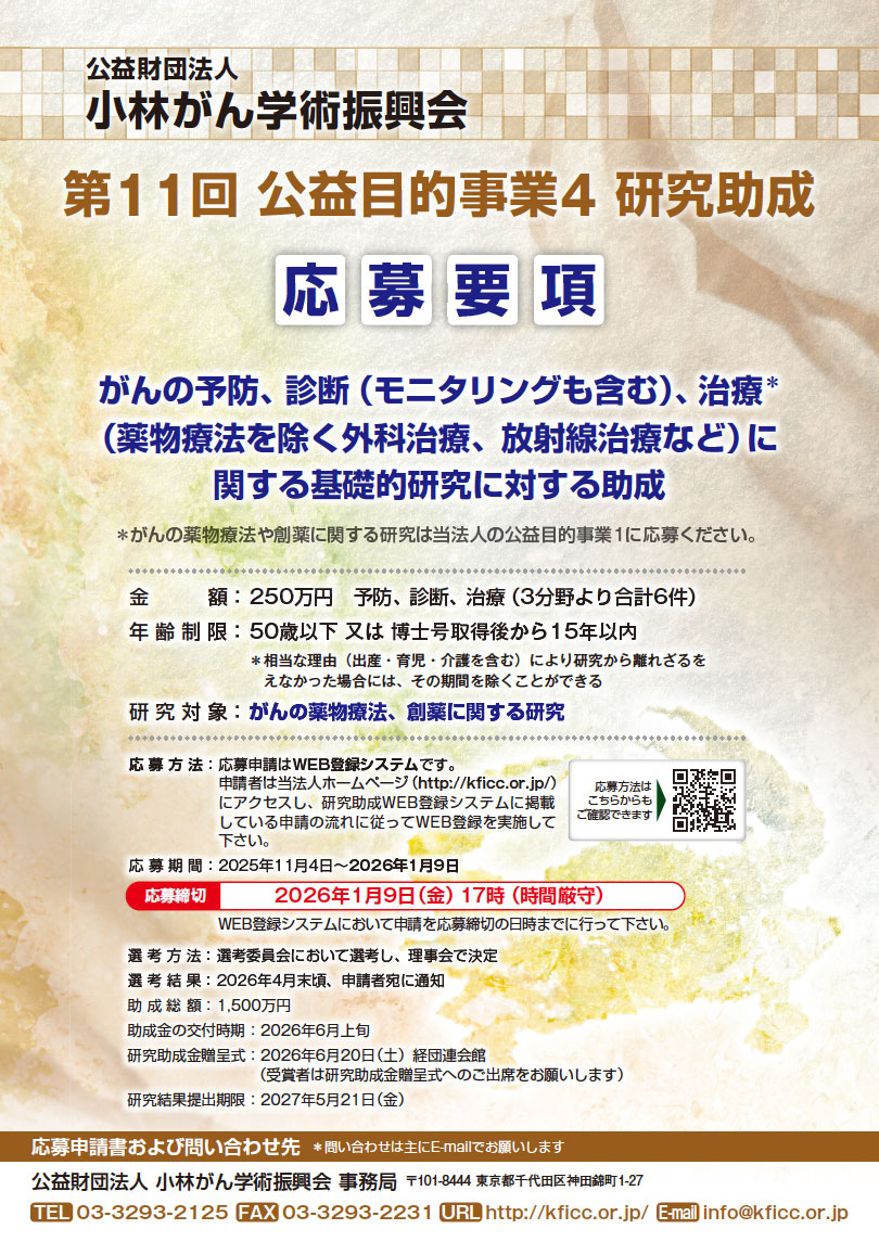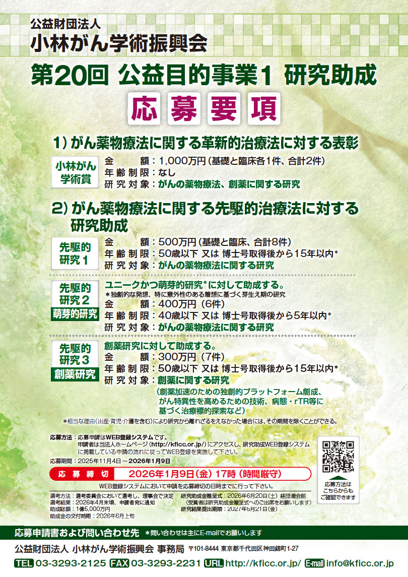 【表彰、研究助成募集開始】(公益財団法人小林がん学術振興会)